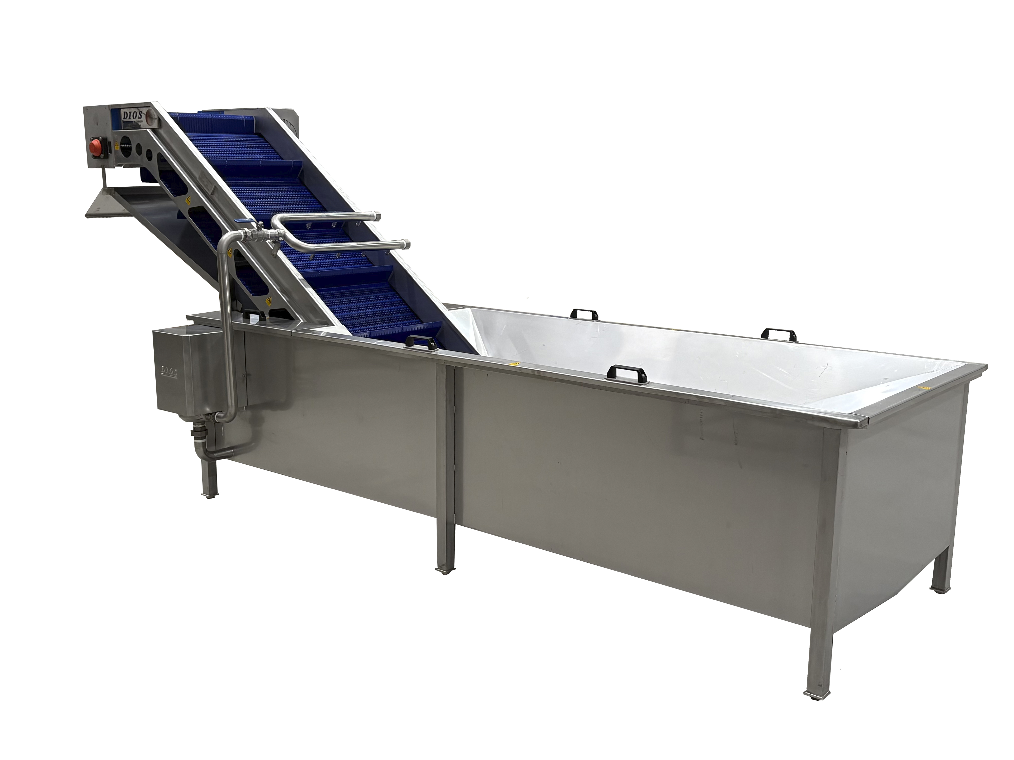 Dimensiones adaptables a las necesidades de producción. Estructura construida en acero inoxidable AISI 316 ó 304. Bandas modulares de polietileno. Accionada por dos motores-reductores eléctrico. Cuatro células de pesaje. Regulación de velocidad por medio de variador de Frecuencia.