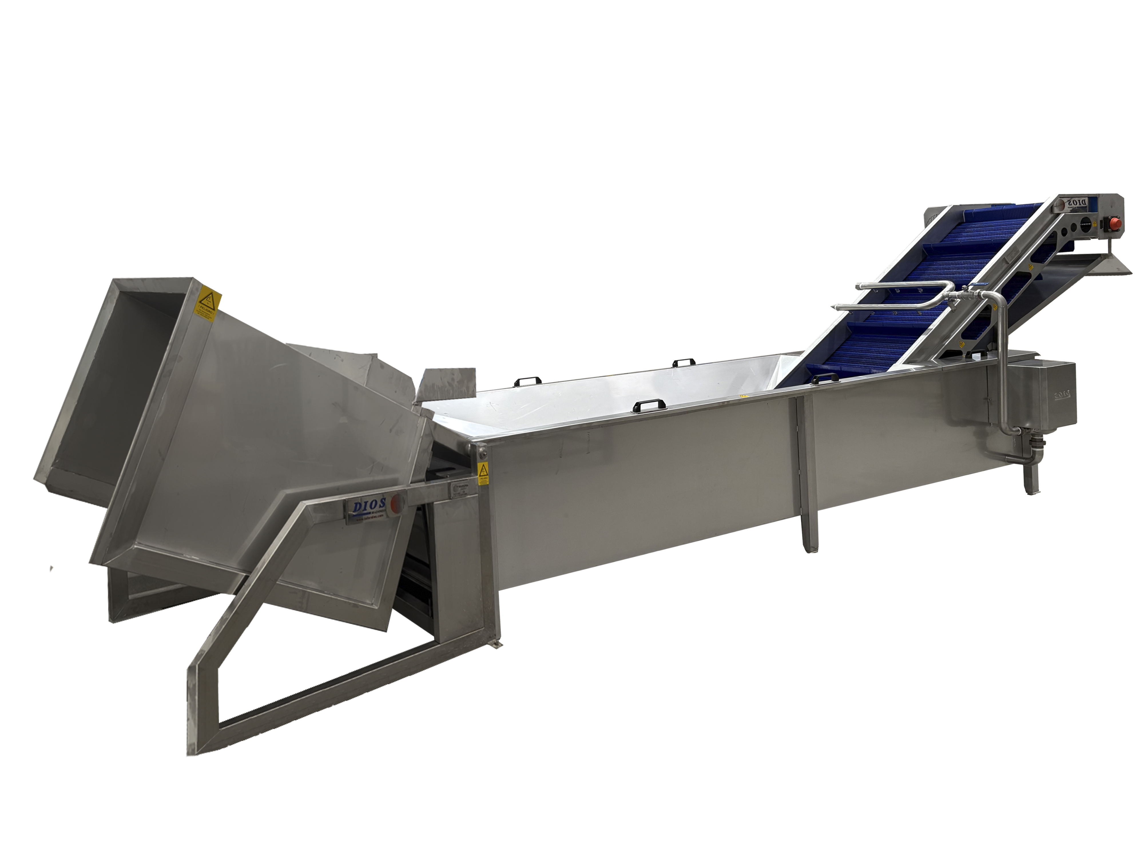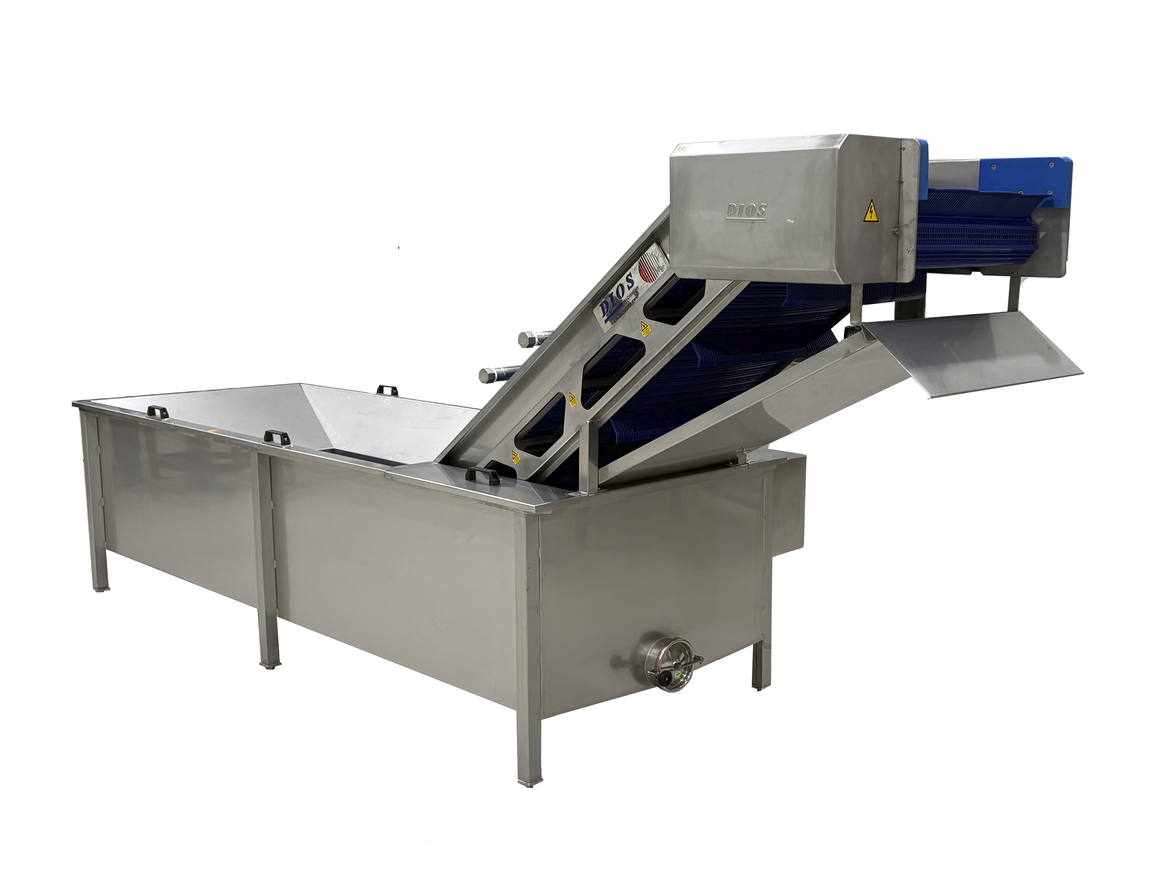 Dimensiones adaptables a las necesidades de producción. Estructura construida en acero inoxidable AISI 316 ó 304. Accionada por un motor-reductor eléctrico.